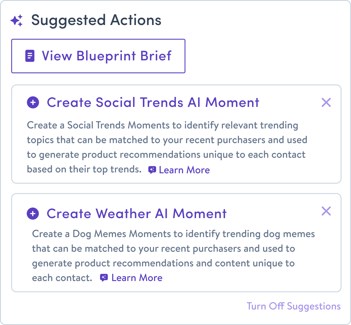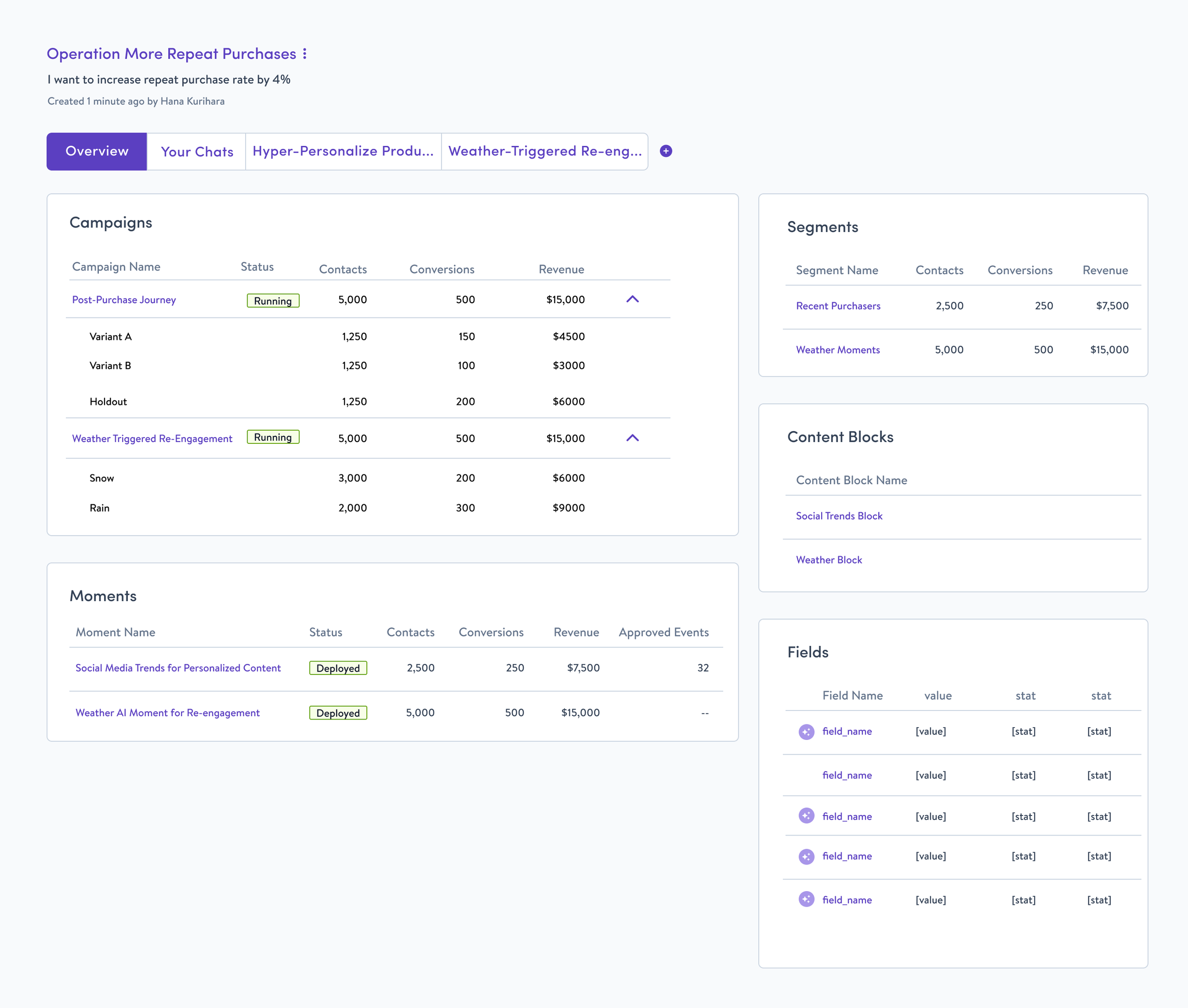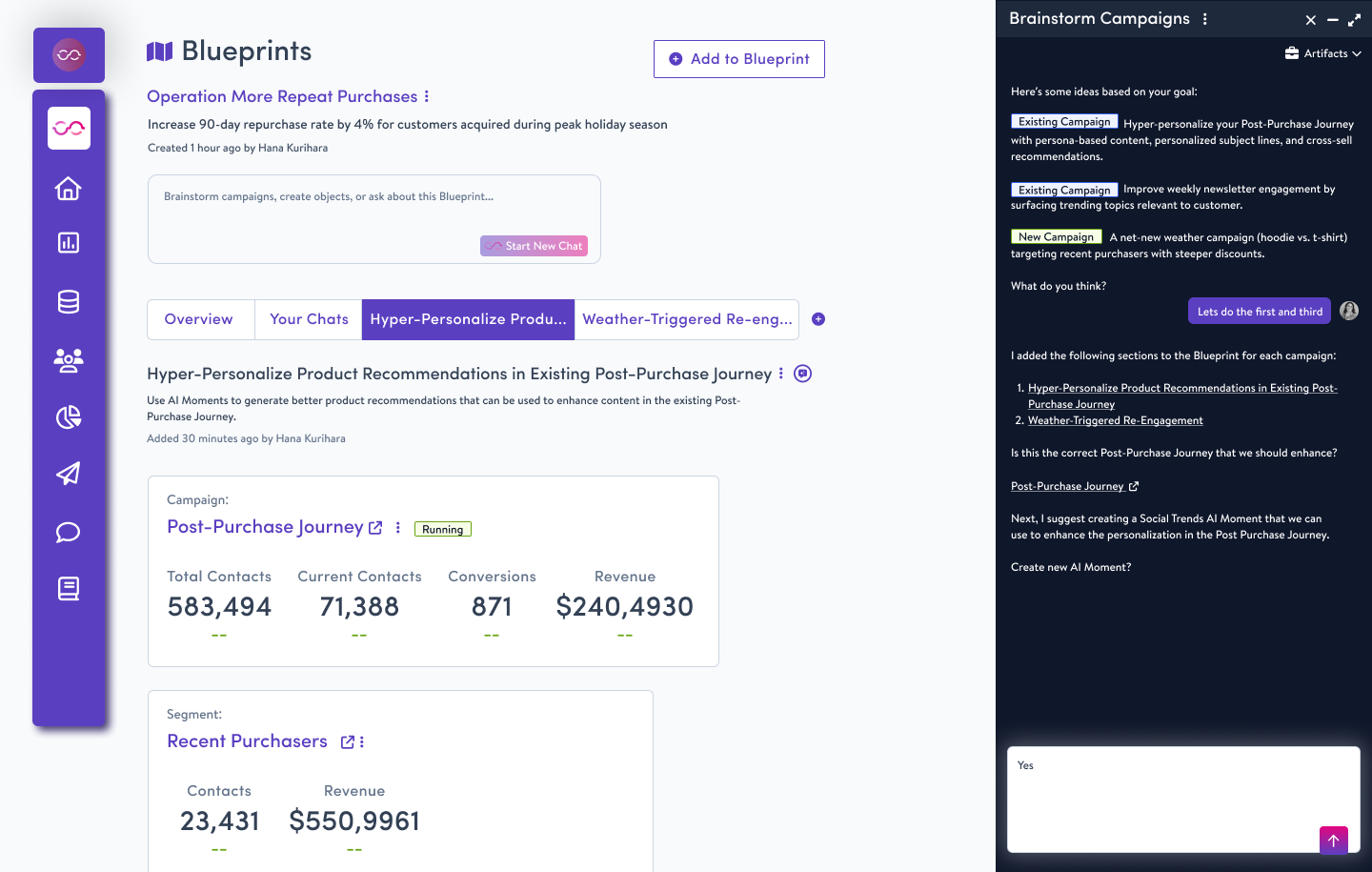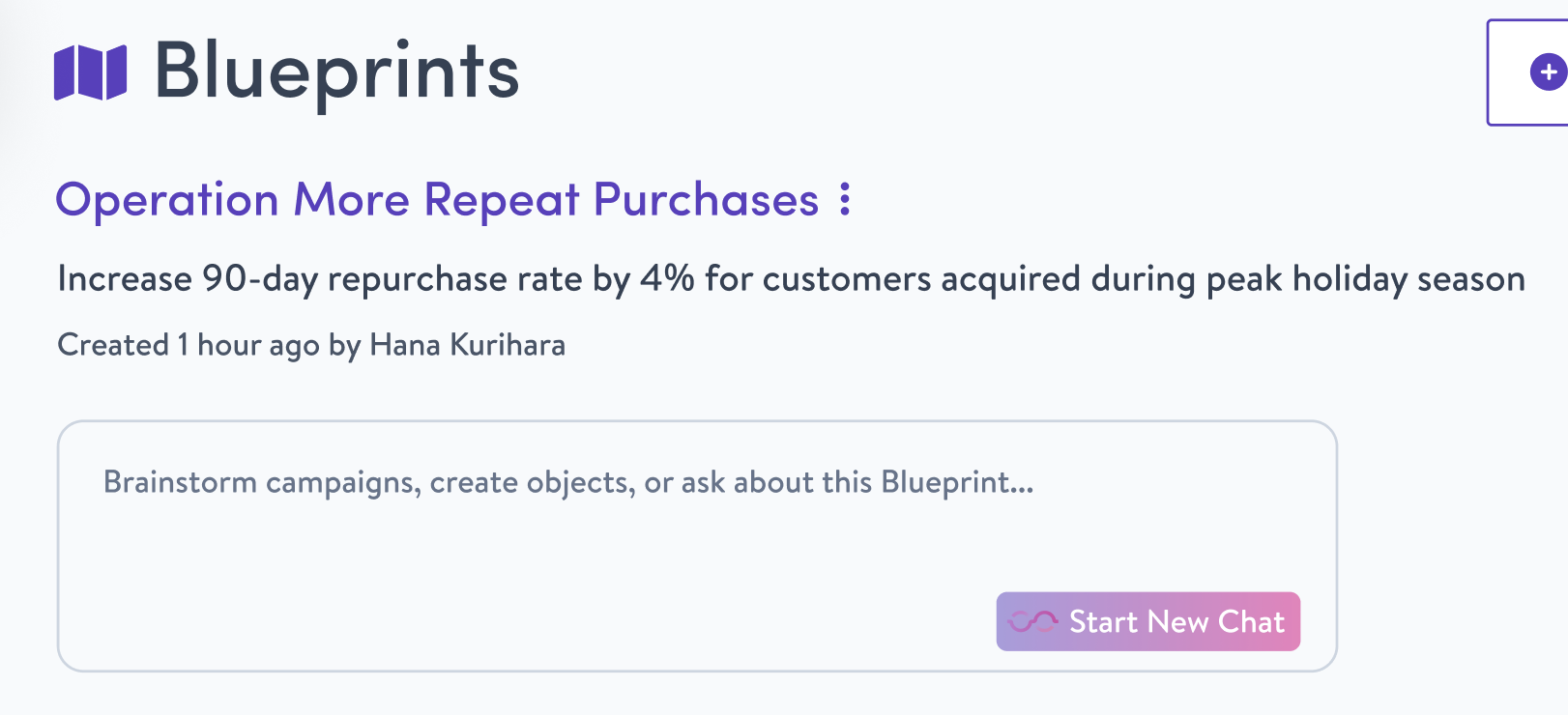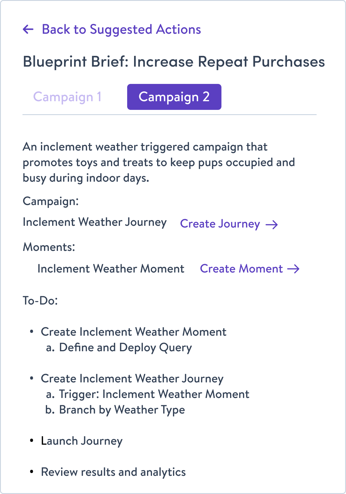 ie. The user enters the goal, “Improve Repeat Purchases” and the Blueprint surfaces new campaign ideas or ways to improve existing campaigns in addition to the steps or objects needed to launch those campaigns.
